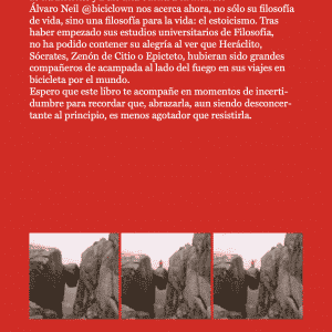 Álvaro Neil @biciclown nos acerca ahora, no solo su filosofía de vida, sino una filosofía para la vida: el estoicismo. Tras haber empezado sus estudios universitarios de Filosofía, no ha podido contener su alegría al ver que Heráclito, Sócrates, Zenón de Citio o Epicteto, hubieran sido grandes compañeros de acampada al lado del fuego en sus viajes en bicicleta por el mundo. Contiene ejercicios prácticos.